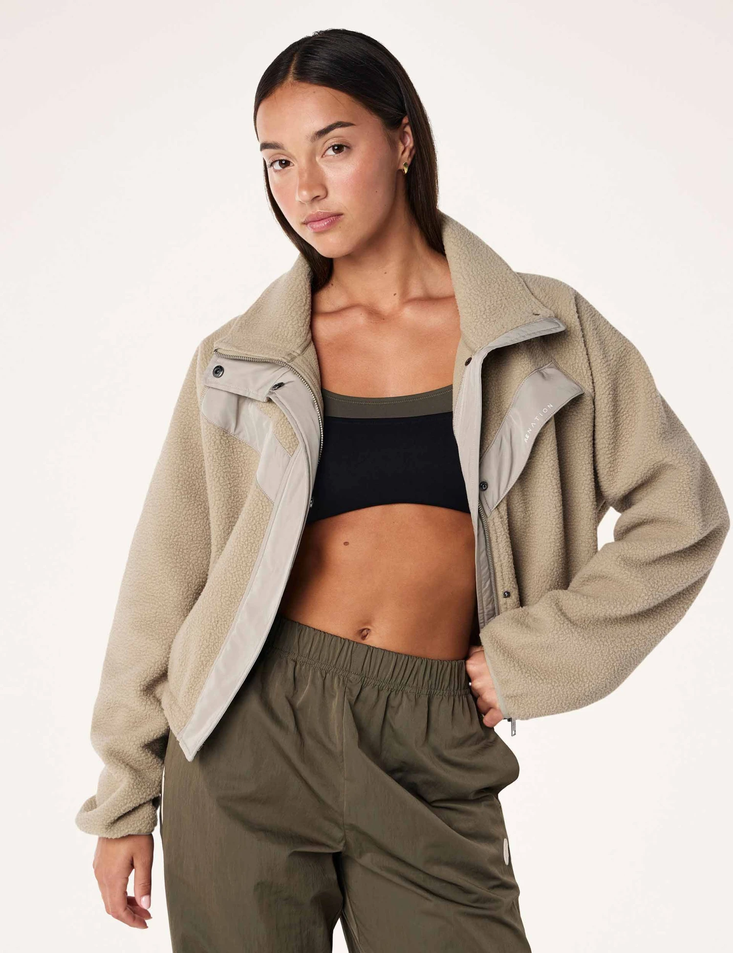 Wrap up the cropped Shelter Sherpa Jacket featuring chevron panelling. Its packable hood and hidden chest pocket add functionality to your cosy layers, making it adventure-ready and effortlessly cool.